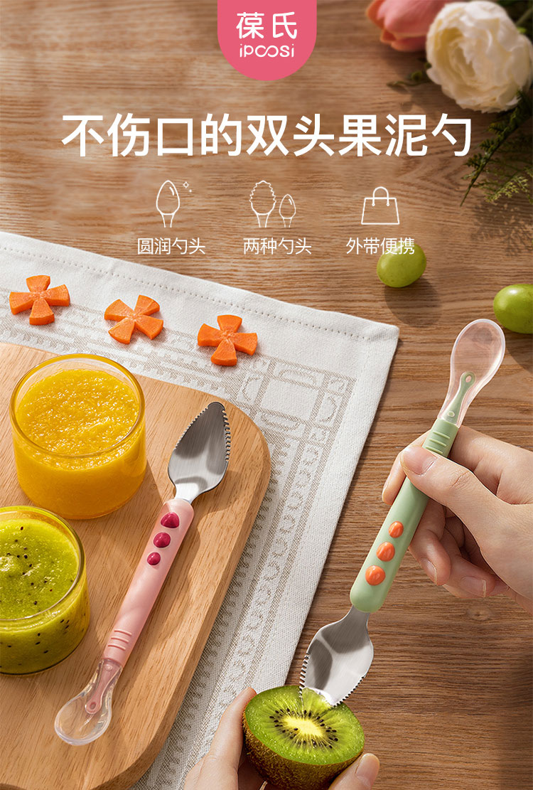 [Baoshi Fruit Moulding Spoon] Baoshi Baby Moulding Spoon Double Head Baby Supplementary Feeding Tool Feeding Silicone Soft Spoon Fruit Moulding Set Green [Quote Price Evaluation]-