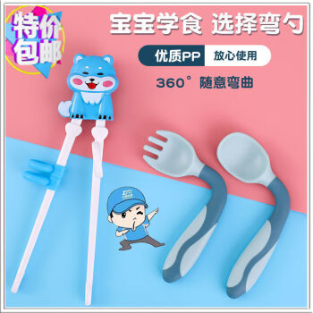 Good child baby feeding training spoon fork can be bent baby elbow fork spoon practice learning food set # Blue Cat - [PP silicone material] * Silicone PP spoon+fork+plastic box [Set] [Image Price Brand Quotation]-