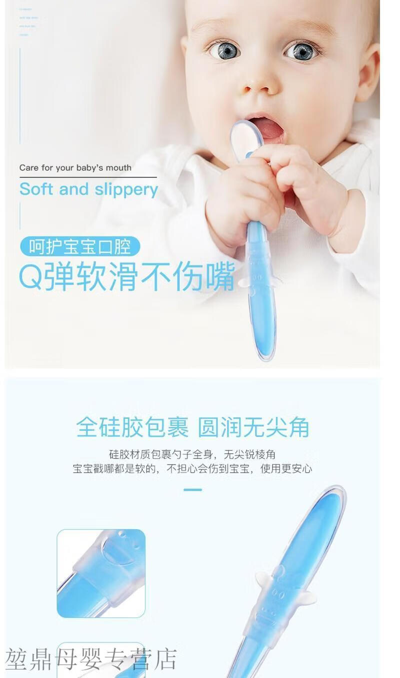 Babies born under Beiqin's brand spoon, silicone gel, 0-3 months, 6-12 years old, complementary food feeding, soft spoon, large meal powder spoon, blue spoon, double ear bowl green